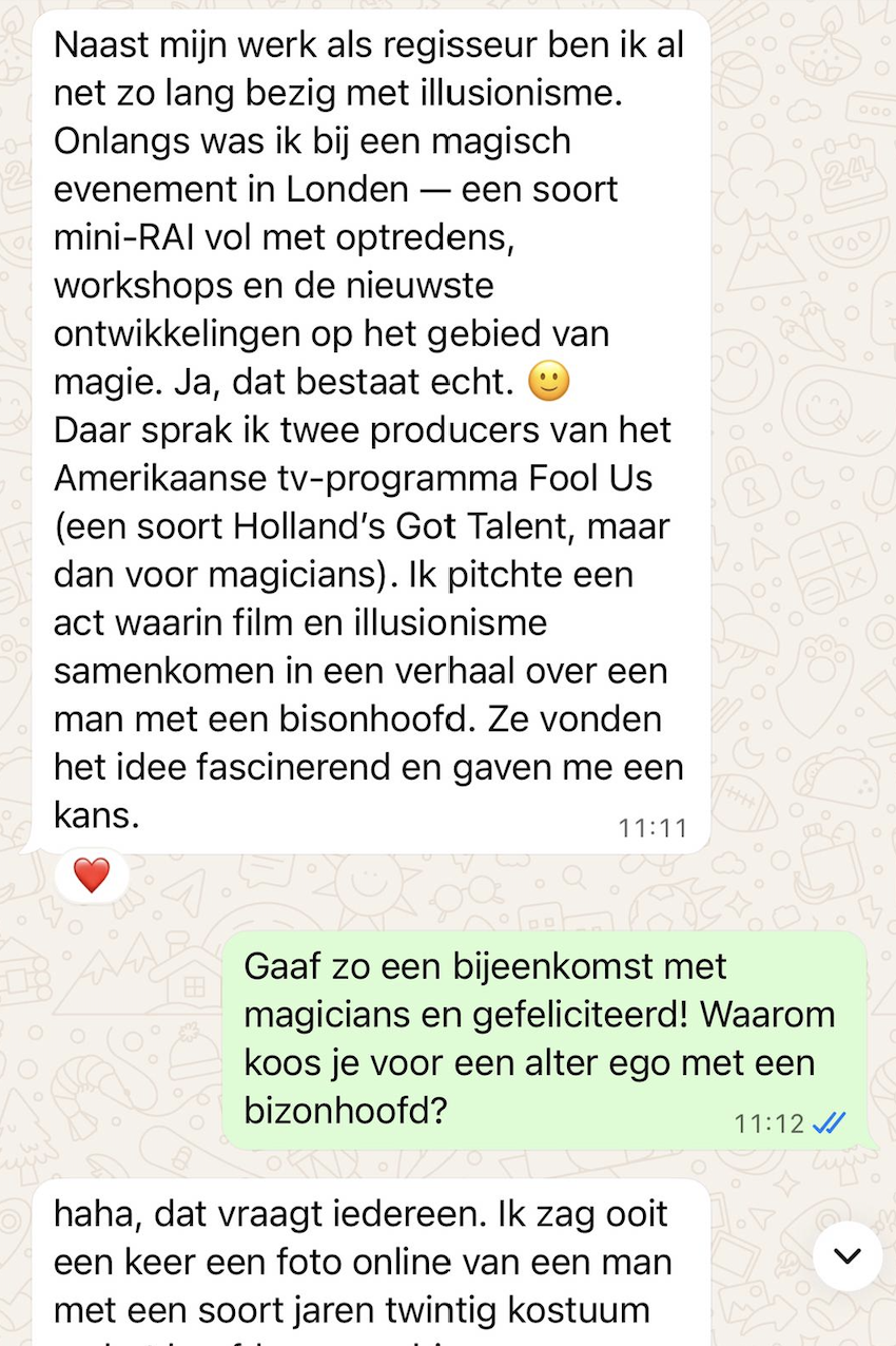Daar sprak ik twee producers van het Amerikaanse tv-programma Fool Us (een soort Holland’s Got Talent, maar dan voor magicians). Ik pitchte een act waarin film en illusionisme samenkomen in een verhaal over een man met een bizonhoofd. Ze vonden het idee fascinerend en gaven me een kans.