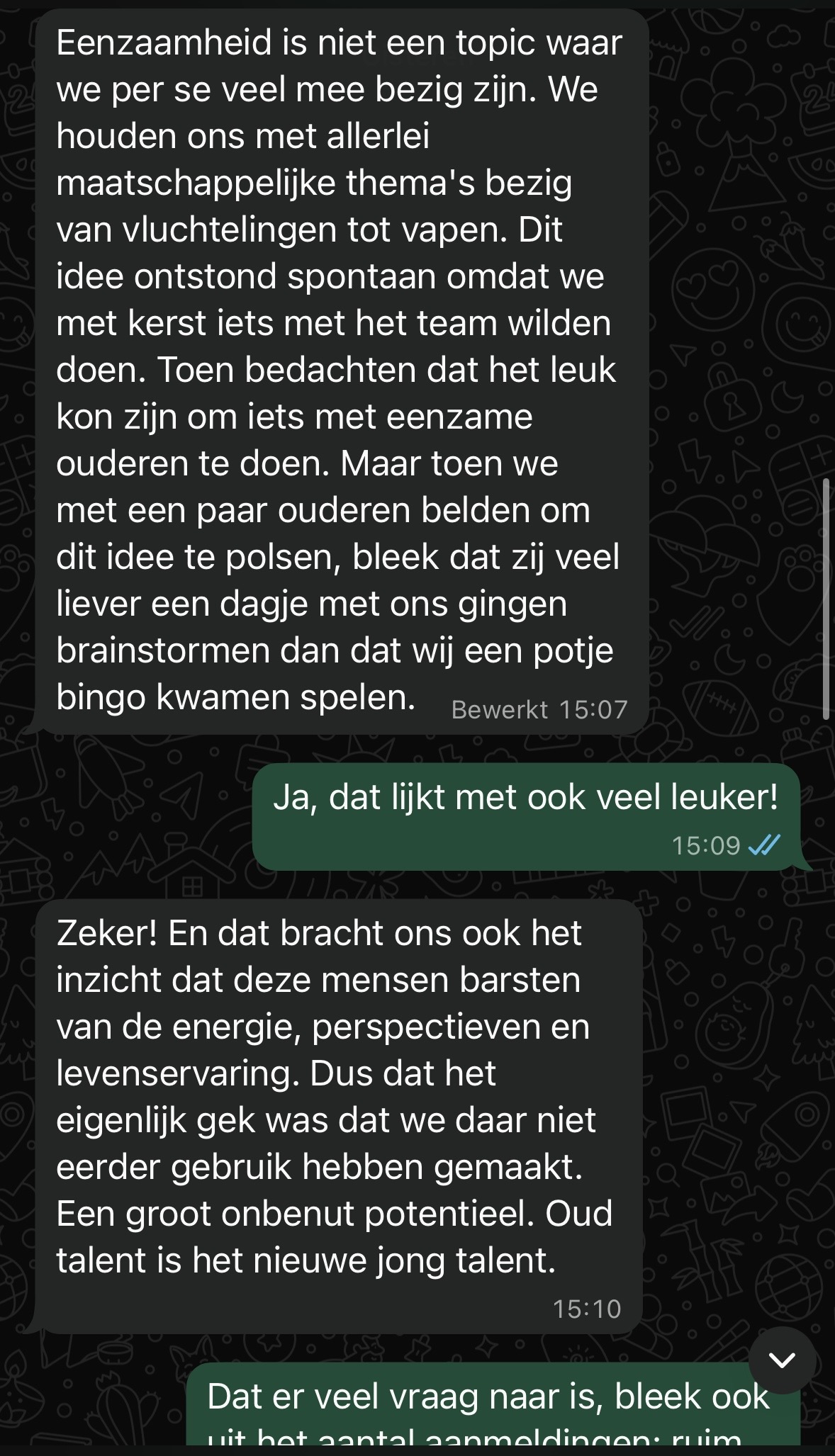 Eenzaamheid is niet een topic waar we per se veel mee bezig zijn. We houden ons met allerlei maatschappelijke thema's bezig van vluchtelingen tot vapen. Dit idee ontstond spontaan omdat we met kerst iets met het team wilden doen. Toen bedachten dat het leuk kon zijn om iets met eenzame ouderen te doen. Maar toen we met een paar ouderen belden om dit idee te polsen, bleek dat zij veel liever een dagje met ons gingen brainstormen dan dat wij een potje bingo kwamen spelen.