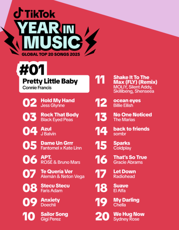 TikTok bleef in het jaar 2025 het startpunt voor wereldwijde muziektrends. Veel meest gestreamde nummers hebben hun populariteit aan het platform te danken, waar tracks al viraal gaan voordat ze de top 50 bereiken. Ook veel artiesten danken hun carrière aan TikTok, waaronder Alex Warren, sombr en Lola Young. Het socialmediaplatform lanceert daarom de belangrijkste muziek-highlights van 2025.
