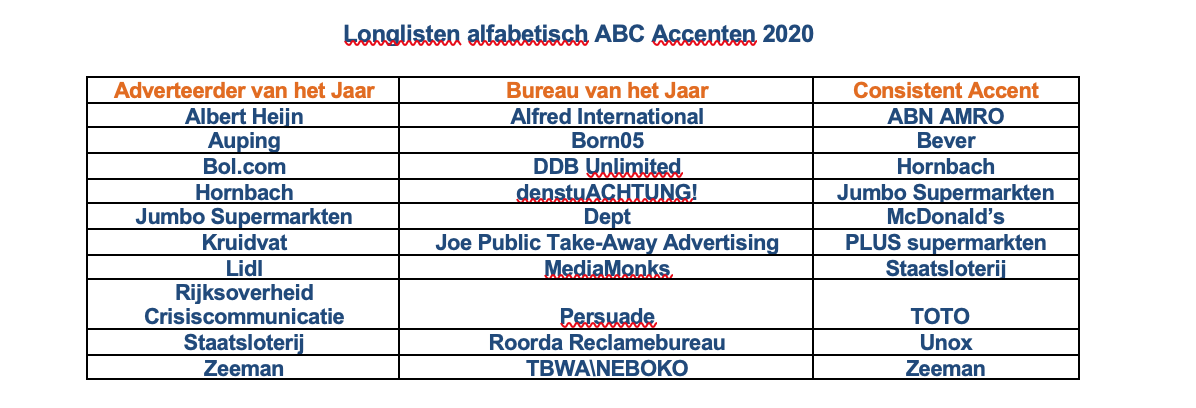 De Longlisten voor de ABC Groot Accenten 2020 zijn bekend. De ABC jury die bestaat uit hoofdredacteuren van Adformatie, FONK en MarketingTribune, bestuursleden van de bvA (Bond van Adverteerders) en bestuursleden van de SAN, aangevuld met twee externe deskundigen, heeft haar keuze bepaald.